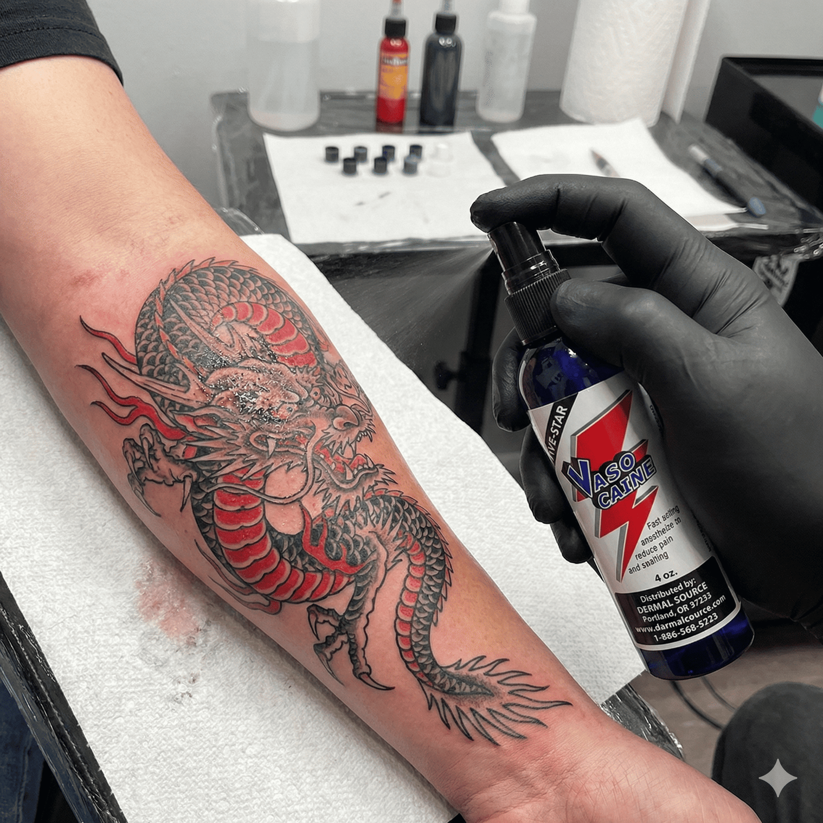 Ce spray n’est pas destiné à être utilisé avant votre séance. Si vous avez besoin de quelque chose à appliquer avant votre rendez-vous, je vous recommande d’utiliser une crème anesthésiante spécialement prévue à cet effet. Cette crème puissante et très efficace doit être appliquée sur la peau environ 1 heure avant votre intervention pour garantir un effet maximal. Alors, pour le pré-tatouage, optez pour la crème anesthésiante.